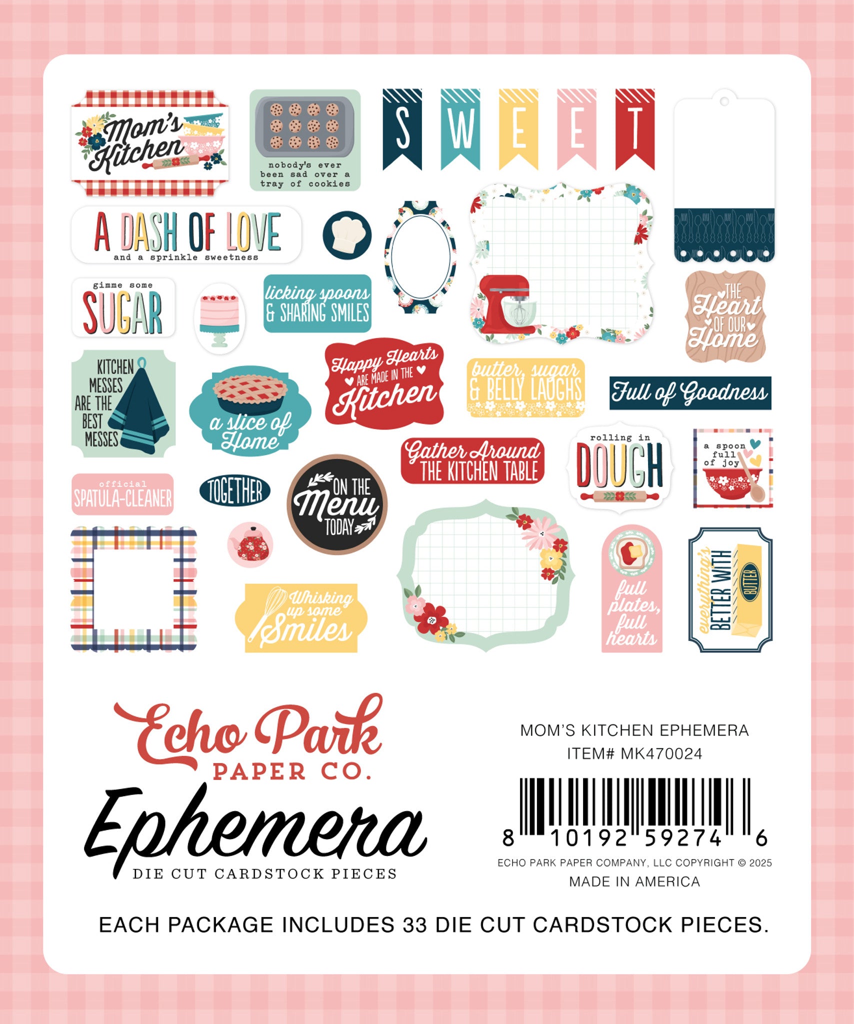 Mom's Kitchen - September 2025 - Ephemera Die Cut Cardstock Pack. Pack includes 34 different die cut shapes ready to embellish any project. Package size is 4.5" x 5.25"